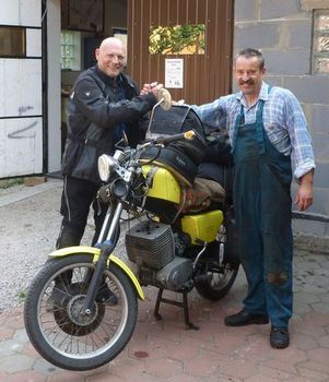 Norbert Berentz in 2012. Norbert Behrentz with Jozef Fajta nach erfolgreicher Reparatur in Likavka (Slowakia) in 2012 with MZ.