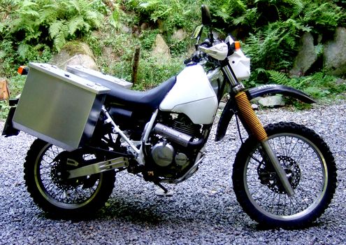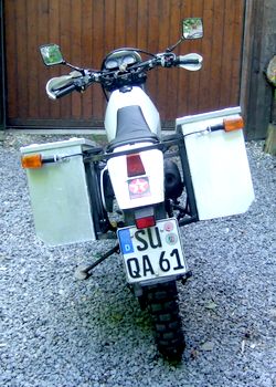 Janine (29 in 2010) aus Köln liebt das Motorrad-Fahren. Leider fehlt ihr nur noch das Kleingeld, um ihre Weltreise ab 2012 zu machen. Wegen des schmalen Auspuffs rechts konnte ich den Träger in der Breite symmetrisch bauen. Da das Motorrad einen Dyna-Starter hat, also auch ohne Batterie rechts angetreten werden kann, musste die rechte Befestigung des Trägers an einem anderen Punkt als am Haupt rahmen mittels Fußraste angebracht werden.