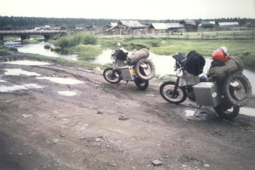 Bernd Tesch Alfred Reetz and Bernd Tesch with "Tesch-Travel-Träger = steel rack" and "Tesch-Travel-Tasche No. 2 = alubox" on Tesch-SUZUKI DR 650 Dakar in Siberia | Foto: