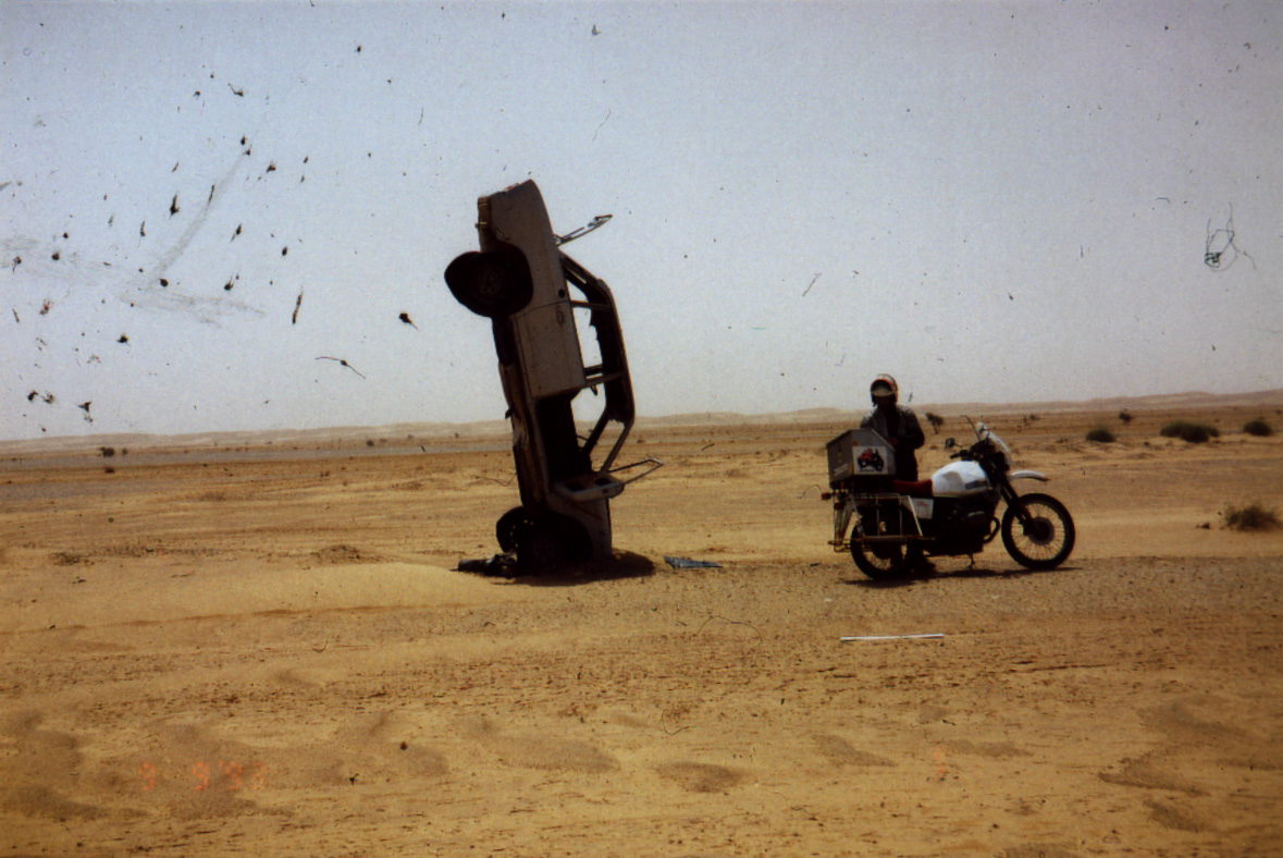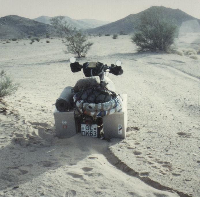 Frank Schuster with "Tesch-Travel-Träger = steel rack" and "Tesch-Travel-Tasche = alubox" in Africa / Sahara | ||