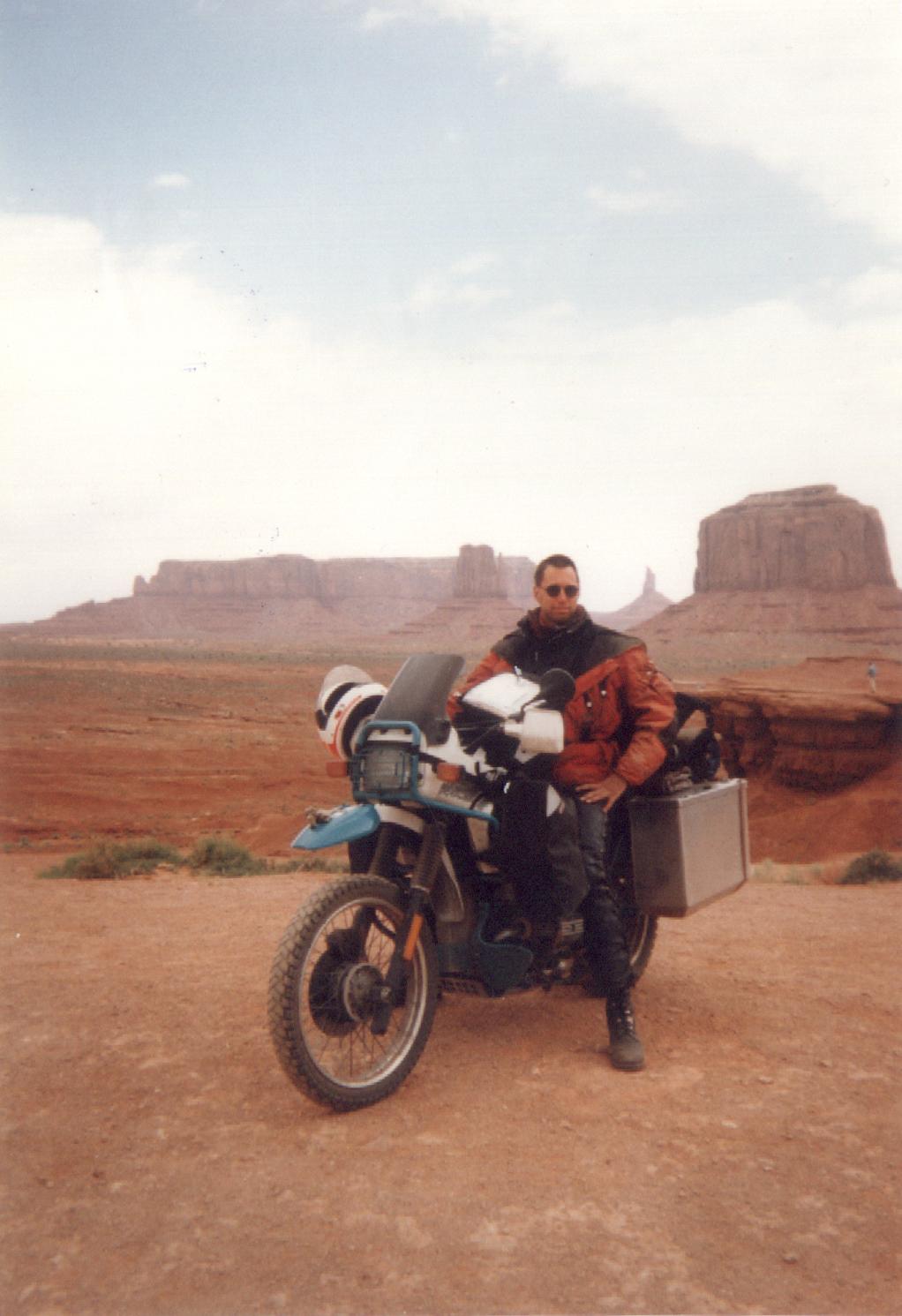 Jörn with "Tesch-Travel-Träger = steel rack" and "Tesch-Travel-Tasche No .4 = alubox" in USA / Monument Valley | Foto: