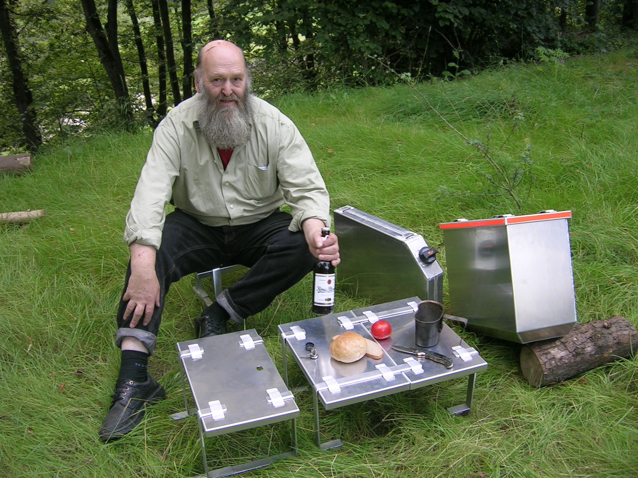 Bernd Tesch Der Motorrad-REISE-Ausrüster Dipl.-Ing. Bernd Tesch konstruiert, baut und testet alles selber: Tesch-Travel-Tasche 5 (re). TTTank 10 Liter (mittig). TTTisch einfach (vorne li). TTTisch doppelt (vorne mi). TTHocker (B.T. sitzt darauf). | Foto: Bernd Tesch The motorcycle-Travel-outfitter Dipl.-Ing. Bernd Tesch constructs, builds and is testing all himself: Alubox "Tesch-Travel-Tasche 5" (ri). fueltank "TTTank 10 liter" (middle). Table "TTTisch" small (in front lefti). Table comfort "TTTisch" double (in front middle). Seat "TTHocker" (B.T. is sitting on it). |
