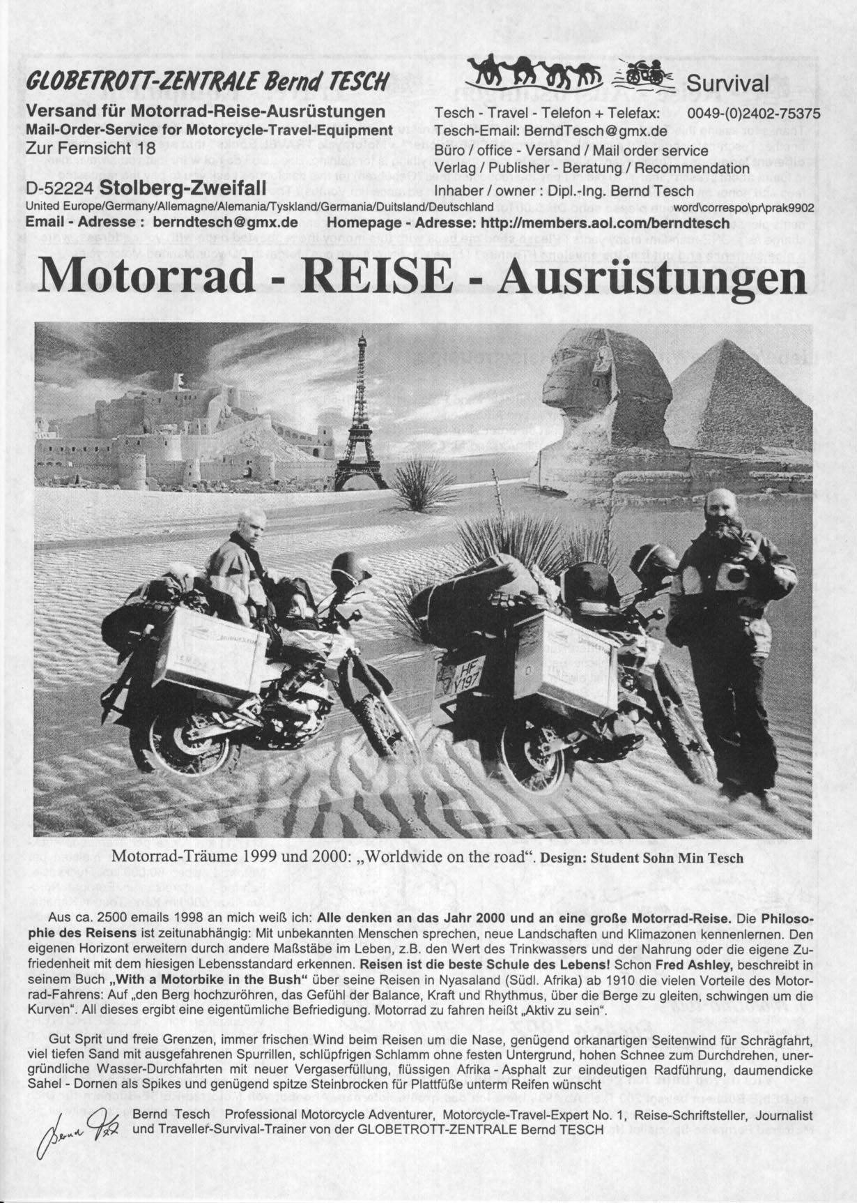 zind mit winzip gepackt und als JPG abgespeichert. In English: Fotos can be downloaded in high quality for publications. Datas are packed with zind and stored as JPG (Copyright) Alle Rechte liegen bei Bernd Tesch. All rights by Bernd Tesch. The fotos can be used by press or anyone for publications after a written permission in advance. berndtesch@gmx.de www.berndtesch.de Bernd Tesch Motorrad-FRENREISE-Expert. Dipl.-Ing. (TH=Uni). Berater. Ausrüster. Hersteller der stabilsten (Stahl-) Gepäckträger und (Alu-) Taschen. Weltweit größtes Angebot von Motorrad-REISE-Büchern. Professional Motorcycle Adventurer. Reise-Schriftsteller. Journalist und Traveller-Survival-Trainer. GLOBETROTT-ZENTRALE Bernd TESCH. Herstellung und Versand von Motorrad-REISE-Ausrüstungen. Grünentalstr. 31. 52152 Simmerath-Hammer/EIFEL (bei Monschau). Germany. Tel: 0049-(0)2473-938686. Fax: 0049-(0)2473-938678. |