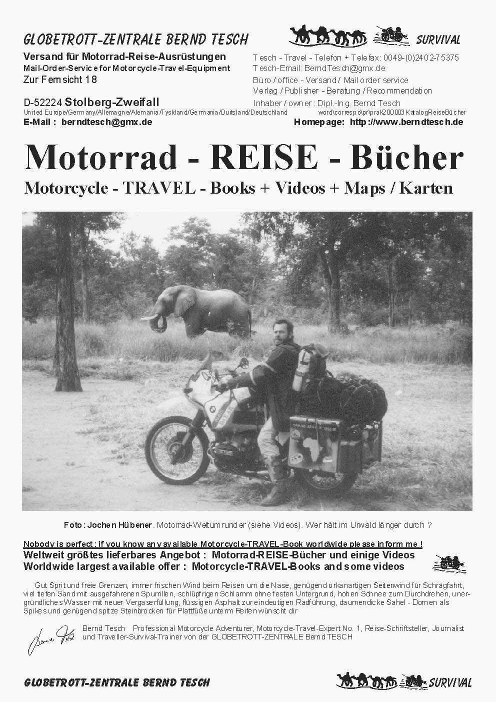 Bernd Tesch is the expert for Motorcycle-Travels wordwide. Especially long distance tours. He has a mail order service (= Versand) and offers the worldwide largest amount of Motorcycle-TRAVEL-Books (In total about 200. In detail: 113 in German, 62 in English (this books are reviewed in English!), 4 in Portuguese, 1 in Spanish, 2 in Danish, 2 in Dutch, 1 in German out of Switzerland, 3 in Greek, 1 in Italian, 2 in German from Austria, 1 in French). Some others. B.T. offers maps for Motorcycle-Travels wordwide in the scale of 1:1 Mio and 1:500.000