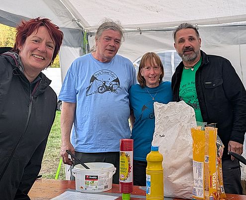 - Ein T(esch)-T(ravel)-T(reffen) endet nie. Es beginnt schon 1 Jahr vorher mit der Festlegung des nächsten Termines und Vorbuchung des Platzes und des Saales. Im Laufe des Jahres bemühe ich mich darum, die zum Kontinent-Schwerpunktthema besten Vorträge zu bekommen- Und mindestens 120 Fichtenstämme a 2 m mit Durchmesser 18-30 cm aus dem Wald zu kaufen. Bernhard Stein, Manfred Heinen, Patricia und ich schleppten die dann 4 Wochen vor dem TTT zum Platz für zwei große Feuer (es sollen die größten in D bei Moto-Treffen sein!). Und die "Jungs" auf dem TTT vergrößern dann noch das Feuer vor Ort....