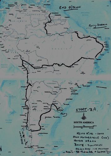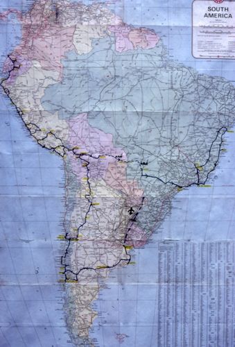 Route: Europe (Germany (Frankfurt- Crossing the Alpes just before the snow (november 1981) - Italy (Genoa).) - We took the cruise line Frederico C from Europe to South-America. The ship-journey was the best way to calm down from the study and get the first contacts on the ship with people living in South America. Brazil was the first stop of our ship in South America. Arriving in Rio de Janeiro at mid night on a warm summer night (November = summer in South America) was the first highlight of our journey. Then the ship went on to Argentina (Buenos Aires) and and arrived there 01.12.1981. We used the "Carnet de Passage" to cross the border with our bikes. It just took some time but besides this we had no problems to take our bikes cross the border of the other countries. We stayed one week in Buenos Aires. After a week we flew by plane ( see map) to the Iguazu waterfalls. Don’t miss this unique natural spectacle ! From Iguazu back to Buenos Aires by plane. Here we started the trip through Argentina going along the east coast down to Villa Gesell. From there we crossed the Pampa to San Carlos de Bariloche at the food of the Andes. Staying a day on a hacienda was the first time we experienced the difference of live in South America compared to Europe. Christmas with 35°C was the next new experience for us. From Bariloche we went to Chile. The first unpaved roads! Next stops Conception and Puerto Mont. Looking at the buildings you could see the German influence from the time when the German emigrants came to this region. New Year’s Eve we spent in a small town called Ensenada at the bottom of the volcano Osorno. We tried to “conquer” the volcano with our bikes… the lava stopped us. From the South of Chile we rode to Villarica, Temuco and Santiago de Chile. Despite of the military dictatorship Santiago was city crowded with very friendly young people. From Santiago we went back to Argentina. Mendoza (Best vine in whole South America), San Juan, La Rioja. In Cachi we had a very good assado (= barbecue) at the police station. The baker from the town was playing the tango on his accordion. We spent the night in the prison cell of the police station. - Unpaved roads lead over Salta to the Bolivian border. Mountains gleamed in spectacular colors. Great! After the Bolivian border the unpaved road was climbing higher and higher. It’s a feeling like riding on a motor-assisted bicycle with 250 kg of weight. Potosi (the silver town), Sucre (the capital of Bolivia), Cochabamba, Oruro (great carnival festivity), La Paz (highest seat of a government in the world) were the next stops of our journey. Close to La Paz we rode to the Chacaltaya the highest point of our trip. From 4000 m we made a daytrip down to the tropical area of the Yungas. Two different worlds in one day. Passing the lake Titicaca including the visit of the Urus (swimming reed islands) we entered Peru and the Inca culture. Several times we went from the Highland down to the coast an back. Tacna, Arequipa, Juliaca, Cuzco, Nazca, Ayacucho, Huancyo, Lima were places where we stopped. From Cusco we took the train to kilometer 88. From there we had a 4 days hike to Machu Picchu. One of the highlights of the journey! From Lima we took the Panamerican Highway to Ecuador. We crossed the equator and came to the most northern point of our trip. The landscape of Ecuador was great. In Ecuador we decided to go to Brazil. The shortest way to come from Ecuador with motorcycles to Brazil leads over Peru and Bolivia. So we went back to Peru and Bolivia. The only possible way to get from Santa Cruz in Bolivia to Brazil was using a train. We checked in on a freight train. Due to the heavy rain in the last week the track bed was very soaked. With an average speed of 30 km/h the train started the ride to Brazil. In the middle of the night the train stopped abruptly. We had a look outside our wagon but we didn’t see anything because of the dark night. So we continued to sleep. Next morning when we awoke we saw what happened… Part of the train was derailed. Petrol and gas carrying wagon were laying around. We waited the whole day. In the evening the rest of the train was pulled back to the train station in Santa Cruz. After some days, when a deviation was built, we started again and entered Brazil. Compared to Bolvia Brazil was a good developed country. Most of the time fine paved roads. In Brazil we visited Sao Paulo, Minas Gerais and its capital Belo Horizonte, Bahia Salvador (very nice colonial town) and Rio de Janeiro. Back to Sao Paulo we sold our bikes and flew back via USA.