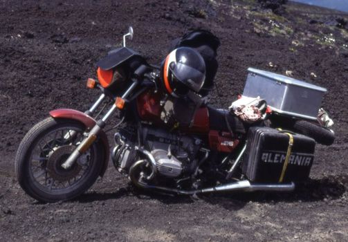 (C) Foto Klaus Schwenk. Li: Elmar Gritschke auf R60/6. BMW R 65 in Chile bergauf auf den Osorno in der Lava.