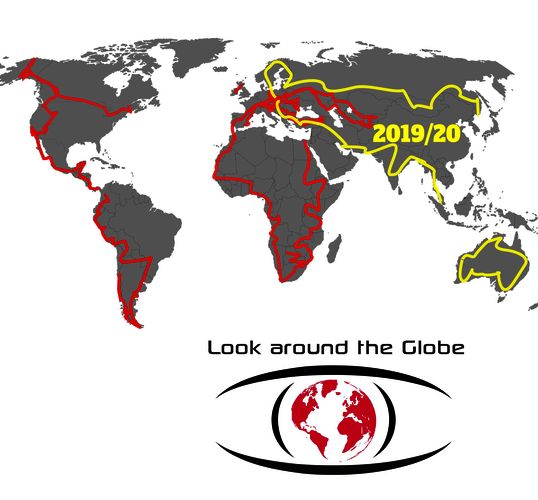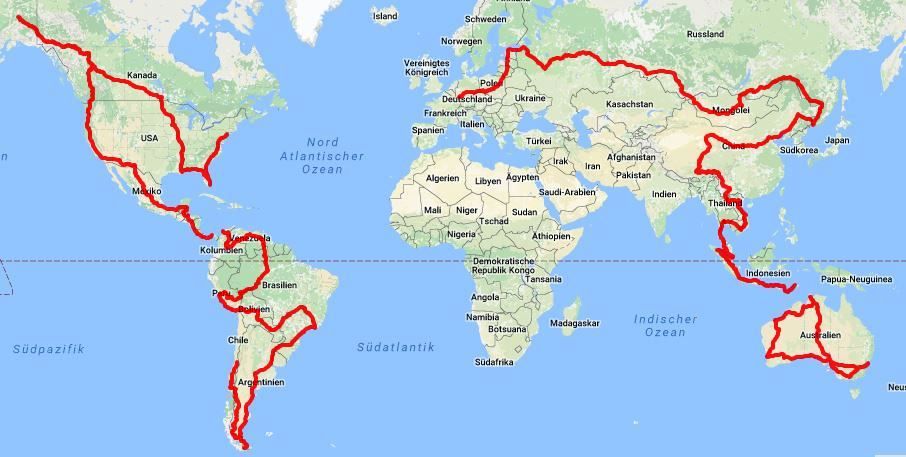 Route: Germany - Hongkong - Austalia - New Zealand. South-America. Nort-America - Germany