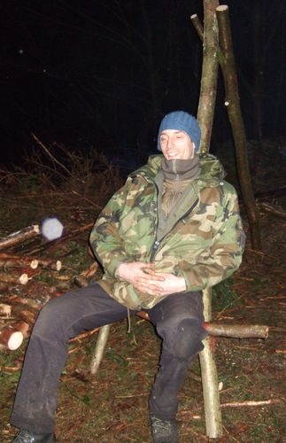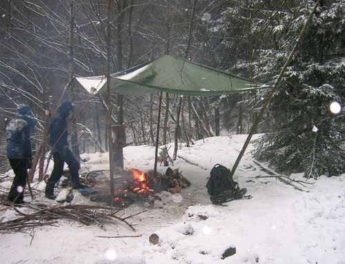 Unterkunft: Gruppen-Behelfshütte ....gehen die nächsten Schritte einfacher. Und man darf schon ´mal zwischendurch ein kleines Freudenfeuer anmachen ! Man kann eine solche Hütte auch als Schutzhütte oder Lager für die Ausrüstung / Holz / Essen anlegen. Gebaut von B.T. und Alfred Reetz als Unterstützer ca 2010.