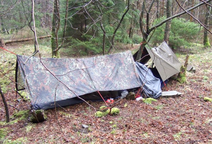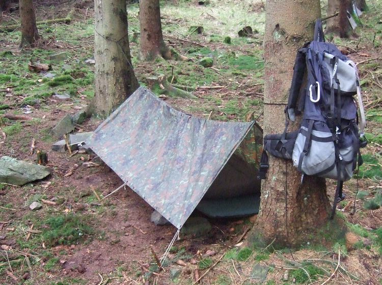 Wenn du wandern solltest und planst, eine solche Hütte zu bauen, packe all deine wichtigen Sachen in einen großen, festen, schwimmfähigen meist schwarzen Plastiksack im Rucksack ein. Diesen kannst du nachts benutzen und über den unteren Fußteil des Schlafsacks ziehen, um dich vor Feuchtigkeit zu schützen.