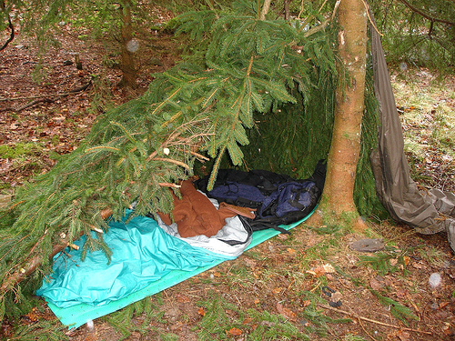 Unterkunft: Eine Einzel-Behelfshütte aus Naturmaterial (ohne Plane) zu bauen ist aufwendiger. Aber möglich.