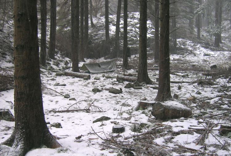 Unterkunft: Ein geeignetes flaches Plätzchen für eine Behelfshütte im Gelände zu finden, ist oft nicht einfach. Aber meist möglich; sonst wird es "möglich gemacht". Zwei feste Bäume und ein relativ flacher Platz: Ebnen!