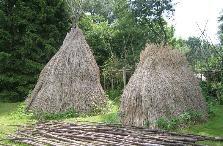 Das Wasser wird hier SEHR gut ablaufen, da die Hütte hoch ist und das Wasser steil abläuft. Die Grasbüschel (oder Stroh) von Wiesen und Wasser-Rändern (Schilf) isolieren auch gut gegen Wind und Kälte. Gras, Stroh, Schilf.. irgedendetwas gibt es fast überall..