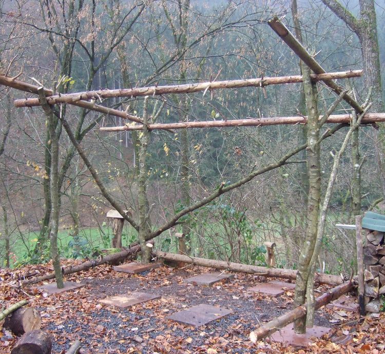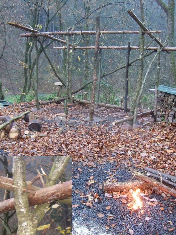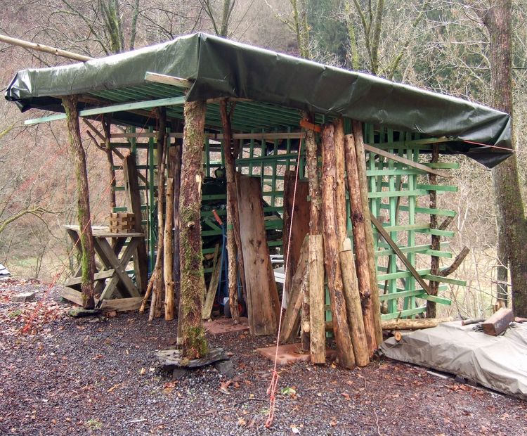 Unterkunft: Gruppen-Behelfshütte .... Meine Idee war es, in 2010 ruckizucki "eine Behelfshütte für eine Gruppe / Materialien zu bauen". Nur mit natürlichen Materialien. Ohne Verwendung von künstlichen Materialien. Nach dem ersten schnellen Errichten des Grundgerüstes forderten ganz viele Aktivitäten meine Zeit im Leben. Schliesslich habe ich erst in 2015 das Grundgerüst an drei Seiten mit "künstlichen Dachlatten" versteift und an den Kreuzungspunkten mit Schauben gesichert und versteift. Das war notwendig aufgrund starker Winde und dicker Schneelast. Hätte ich das alles mit selbstgemachten Seilen aus natürlichen Materialien wie Gräser oder Wurzeln gemacht.. 2018: Gut bewährt gegen Regen hat sich der breiste Rand an allen Seiten. Als Abdeckplane habe ich eine alte LKW-Plane benutzt.