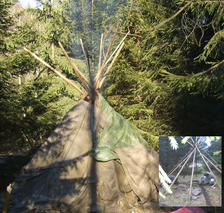 Unterkunft: Behelfshütte für Gruppen. Tepee mit zentralem Feuer. Gebaut auf Tesch-Survival-Training. Foto B.T.
